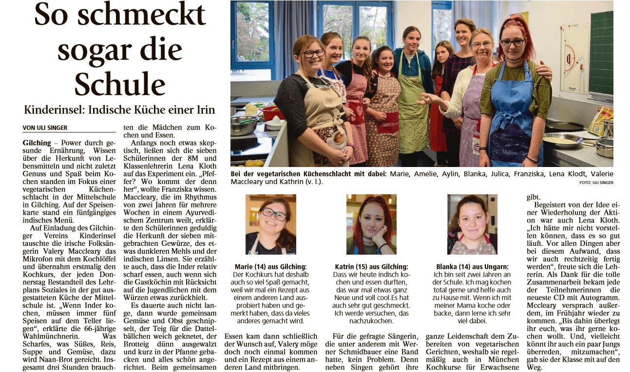 Auf Einladung der Gilchinger Kinderinsel übernahm die irische Folksängerin Valery Maccleary erstmalig den Kochkurs, der jeden Donnerstag innerhalb des Lehrplans Soziales in der gut ausgestatteten Küche der Mittelschule stattfindet. „Wenn Inder kochen, müssen immer fünf Speisen auf dem Teller liegen“, erklärte die 66-Jährige Wahlmünchnerin. Was Scharfes, was Süßes, Reis, Suppe und Gemüse, dazu wird Naan-Brot gereicht. Anfangs noch etwas skeptisch ließen sich die sieben Schülerinnen der 8M und Klassen-Lehrerin Lena Kloth überraschend schnell auf das Experiment ein. „Pfeffer? Wo kommt der denn her“, wollte Franziska wissen. Maccleary, die im Rhythmus von zwei Jahren für mehrere Wochen in einem Ayurvedischem Zentrum weilt, erklärte den Schülerinnen geduldig die Herkunft der sieben mitgebrachten Gewürze, des etwas dunkleren Mehls und der indischen Linsen. Sie erzählte auch, dass die Inder relativ scharf essen, auch wenn sie sich auf Rücksicht auf die Jugendlichen mit dem Würzen etwas zurückhielt. Es dauerte auch nicht lange, dann wurde gemeinsam Gemüse und Obst geschnipselt, der Teil für die Dattelbällchen angerührt, der Brotteich dünn ausgewalzt und kurz gebacken und alles schön angerichtet. Beim gemeinsamen Essen kam dann schließlich der Wunsch auf, Valery möge doch noch einmal kommen und ein Rezept aus einem anderen Land mitbringen. Für die 66-Jährige, die kürzlich erst einen Auftritt in Gilching hatte, kein Problem. Denn neben Singen gehört ihre ganze Leidenschaft dem Zubereiten von vegetarischen Gerichten, weshalb sie regelmäßig auch in München Kochkurse für Erwachsene veranstaltet. Begeistert von der Idee einer Wiederholung war auch Lena Kloth. „Ich hätte mir nicht vorstellen können, dass es so gut läuft. Vor allen Dingen aber bei diesem Aufwand, dass wir auch rechtzeitig fertig werden.“ Als Dank für die tolle Zusammenarbeit bekam jede der Teilnehmerinnen und auch die Klassenlehrerin die neueste CD mit Autogramm. Mccleary versprach außerdem, im Frühjahr wieder zu kommen. „Bis dahin überlegt ihr euch, was ihr gerne kochen wollt“, gab sie der Klasse mit auf den Weg. Uli Singer