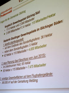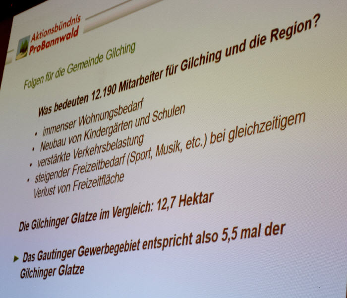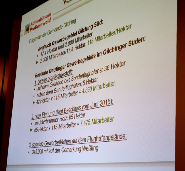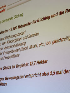 Mehrmals betonte SPD-Landtagskandidat und Aktionssprecher Christian Winklmeier am Mittwoch auf der Pro-Bannwald-Veranstaltung im Freizeitheim Geisenbrunn, dass es sich keinesfalls um eine Protestveranstaltung handle, sondern lediglich um eine Infoveranstaltung. Hä? Infoveranstaltungen haben normalerweise den Anspruch, pro und contra gleichermaßen zu behandeln. Keinesfalls aber darf auf einer seriösen Infoveranstaltung mit Zahlen gehandelt werden, die jeglicher Grundlage entbehren. Den rund 150 Bürgern aber wurde hier ein Rechenexemple suggeriert, das selbst Erstklaßler als ungenügend einstufen würden (36 Hektar plus 5 Hektar sind laut Winklmeier 42 Hektar - Schautafel 1). Ganz nach dem Motto, jetzt greife ich mal in eine Lostrommel und lasse das Schicksal entscheiden, was letztendlich herauskommt. Und so wurden aus geplanten 20 Hektar Gewerbegebiet - inklusive einer Geothermie-Anlage, von der auch die Gemeinde Gilching profitieren will - laut Winklmeier 107 Hektar, die Gauting als Gewerbeflächen beschlossen habe.